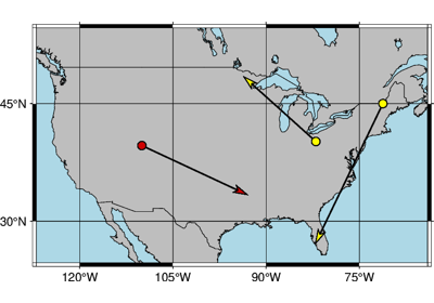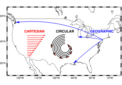 style="V"orstyle="v"), then should be a list of two 1-D arrays with the vector directions. These can be angle and length, azimuth and length, or x and y components, depending on the style options chosen.projection (